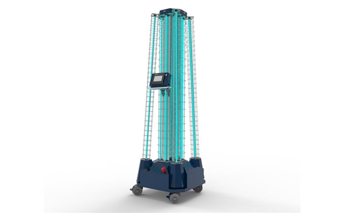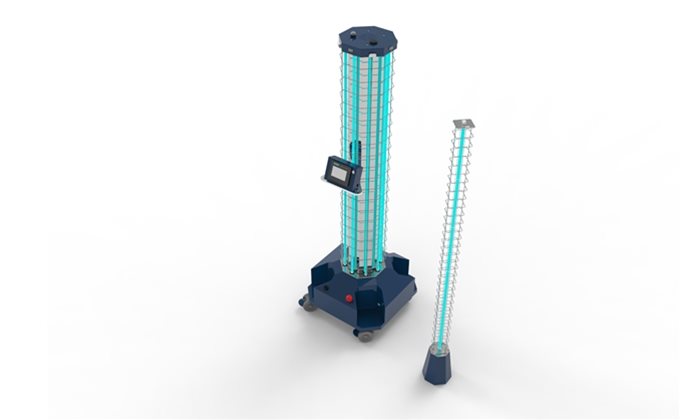 The central tower comprises 8 high power UV-C lamps spaced evenly around the perimeter of the unit in a vertical orientation, and one smaller compact lamp on the underside of the unit. Each satellite tower comprises a single high power lamp for disinfection of harder to reach spaces such as under furniture, patient en-suite bathrooms, WC’s etc.