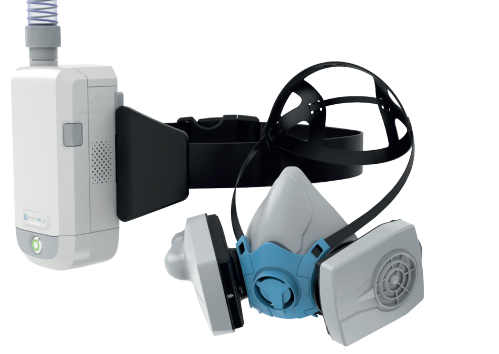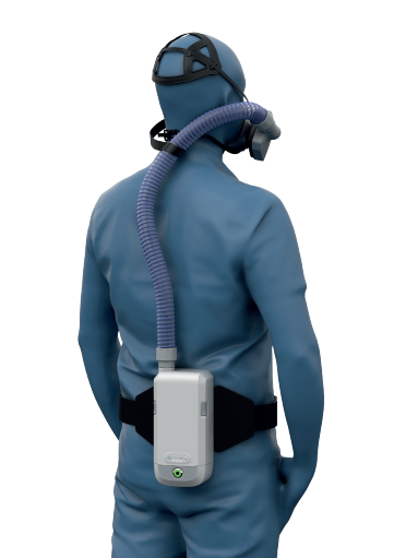 - Power assisted fan provides positive air pressure to the mask